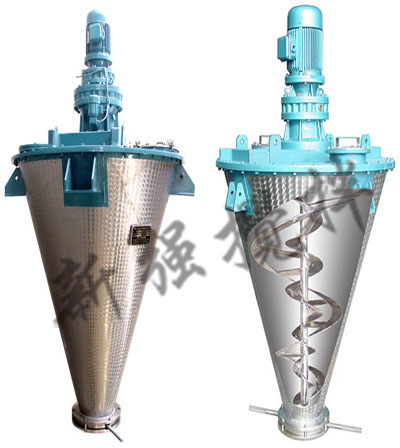單錐雙螺旋錐形混合機,它由傳動部分、筒蓋、螺旋、筒體、出料閥等組成。